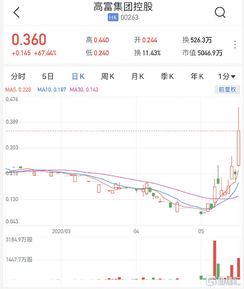 格隆汇5月19日丨高富集团控股(00263.HK)暴涨超67%,暂列港股涨幅榜第一,报0.36港元,成交526万港元,总市值5047万港元。