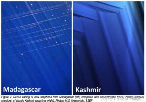 但是研究发现,马达加斯加 Bemainty 地区出产的蓝宝石内部存在与克什米尔相似的丝状包裹体,从而产生Milkiness「丝绒感」,很容易与克什米尔产地混淆,但是两者在净度、生长带、色带和内部包裹体上均有明显差异。这更突出的体现了克什米尔蓝宝石的独特性和稀缺性,无可取代。