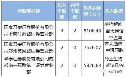 今日,净买入额位居前三的营业部为国泰君安上海江苏路营业部、国泰君安郑州黄河路营业部、华泰证券成都南一环路第二营业部,涉及美格智能等热门股,总买入净额分别为0.81亿元、0.75亿元、0.58亿元。