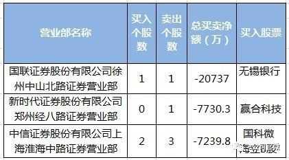 净卖出额位居前三的营业部为国联证券徐州中山北路营业部、新时代证券郑州经八路营业部、中信证券上海淮海中路营业部,涉及无锡银行等热门股,总卖出净额分别为2.07亿元、0.77亿元、0.72亿元。