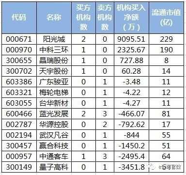 其中,阳光城、中科三环、晶瑞股份等4股呈现机构净买入态势,合计净买入1.22亿元。赢合科技、中通客车、量子高科等9股呈现机构净卖出态势,合计净卖出0.95亿元。