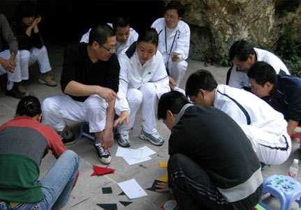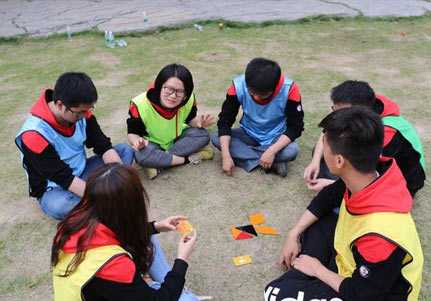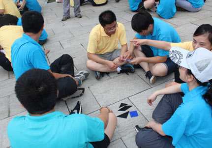七巧板一般来说就是七块板组成的部分,首先按人数分成组,然后每个组有一块配置的图,也就是任务图,任务图不能给别人看,只能自己看,而每一组分配的图,都不一样的,只能在旁边的组哪里找到,也就是训练他们的团队能力。