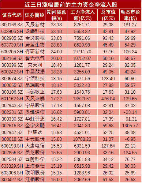 有了资金面的加持,上述个股的市场表现大多比较优异。据统计,这431股中,近三日有353股跑赢大盘,占比82%;更有68股表现异常出色,期间累计涨幅超过10%。其中,天晟新材、龙蟠科技和金逸影视表现最为优异,近三日均涨停收盘。蔚蓝生物、有研新材和智光电气紧随其后,期间累计涨幅均超过20%。