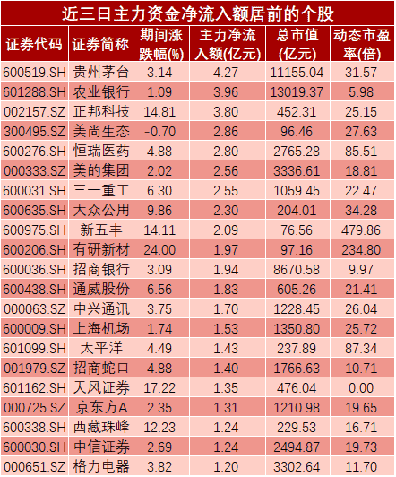 具体到个股来看,“股王”贵州茅台近三日累计净流入4.27亿元居首;“巨无霸”之一的农业银行居次,期间净流入3.96亿元;而被股民戏称为上半年最赚钱“科技股”的正邦科技位列第三,期间净流入3.80亿元。另有美尚生态、恒瑞医药、美的集团、三一重工、大众公用和新五丰6股期间净流入额也较多,均超过2亿元。