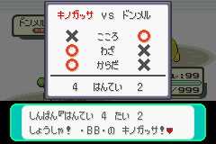 如果你一味强攻,系统就不会有什么提示,直到你击败对方所有精灵的时候,比赛才会结束;如果你使用了某些辅助技,而且取得很好的效果,在3回合内,即使你没有把对方的HP打成0,系统也会判你获胜。也就是说,使用有战术性的辅助招式,获胜的几率将会更大。如果你没有把握一击就打倒对方,就采取软进攻方式吧。