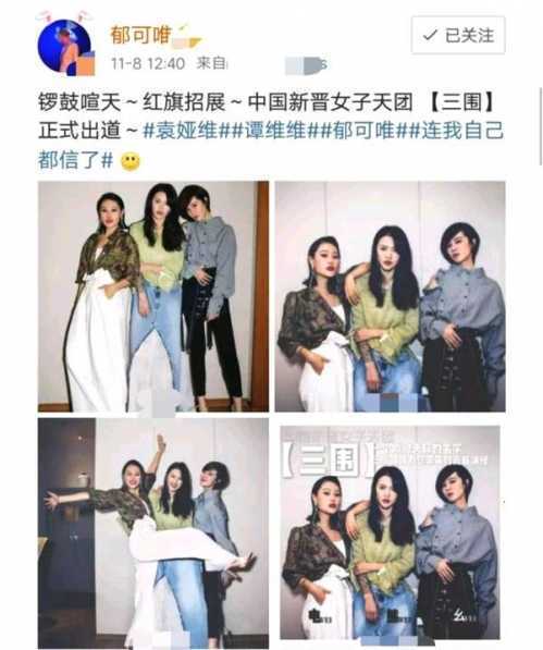 这个组合由内地乐坛三位实力女歌手袁娅维、谭维维、郁可唯聚在了一起,组成了“女子天团”,大家一起胡吃海喝,一起上杂志封面,可以说绝对不是塑料姐妹花了,姐妹情浓啊!