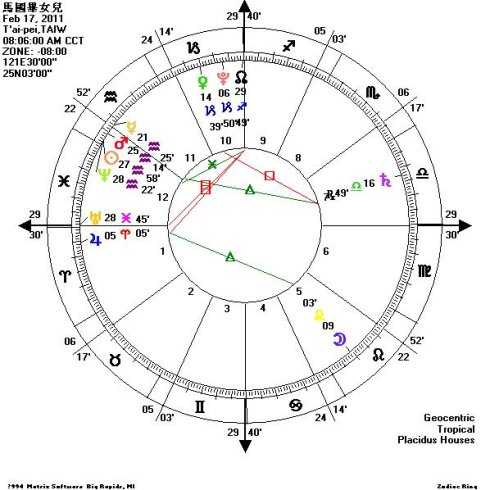 不过,就事业的部分来说,搞不好十几二十年后,我们也会在演艺圈中看到马国毕的女儿欧!因为命主的工作宫在第六宫落在狮子座,第六宫与一个人的工作运有关,然后狮子座与舞台、表演、活动有关,所以命主未来的工作运基本上会是与演艺圈有关的,与电视圈比较有关,未来也会有从幕前转幕后的状况。