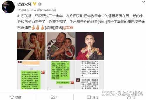 如今这么多年过去了,火风今天晒照感慨时光过的太快,当年抱他的时候才四岁,如今已经24岁了。火风晒照说:时光飞逝,眨眼已过二十余年。在你四岁时把你抱回家中的情景历历在目,我的小洛松已成为汉子了,你要飞翔了…飞出属于你的世界,洛松丁增我的康巴汉子老爸祝福你。之后还艾特了霍尊!
